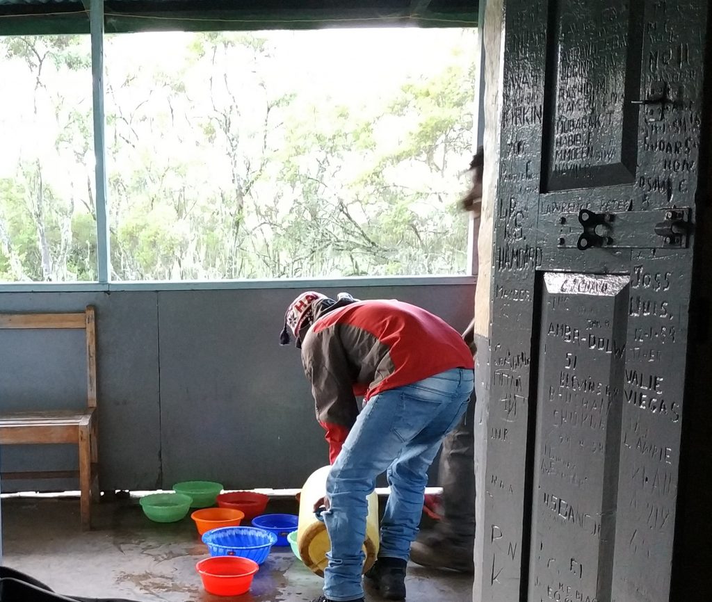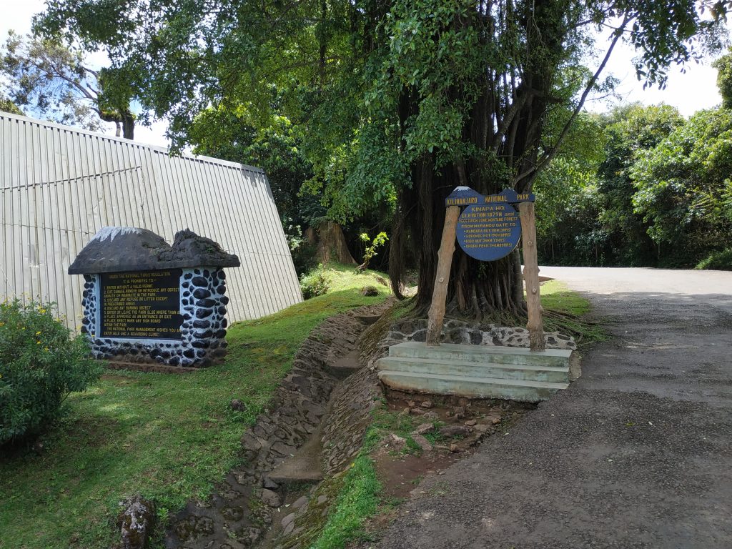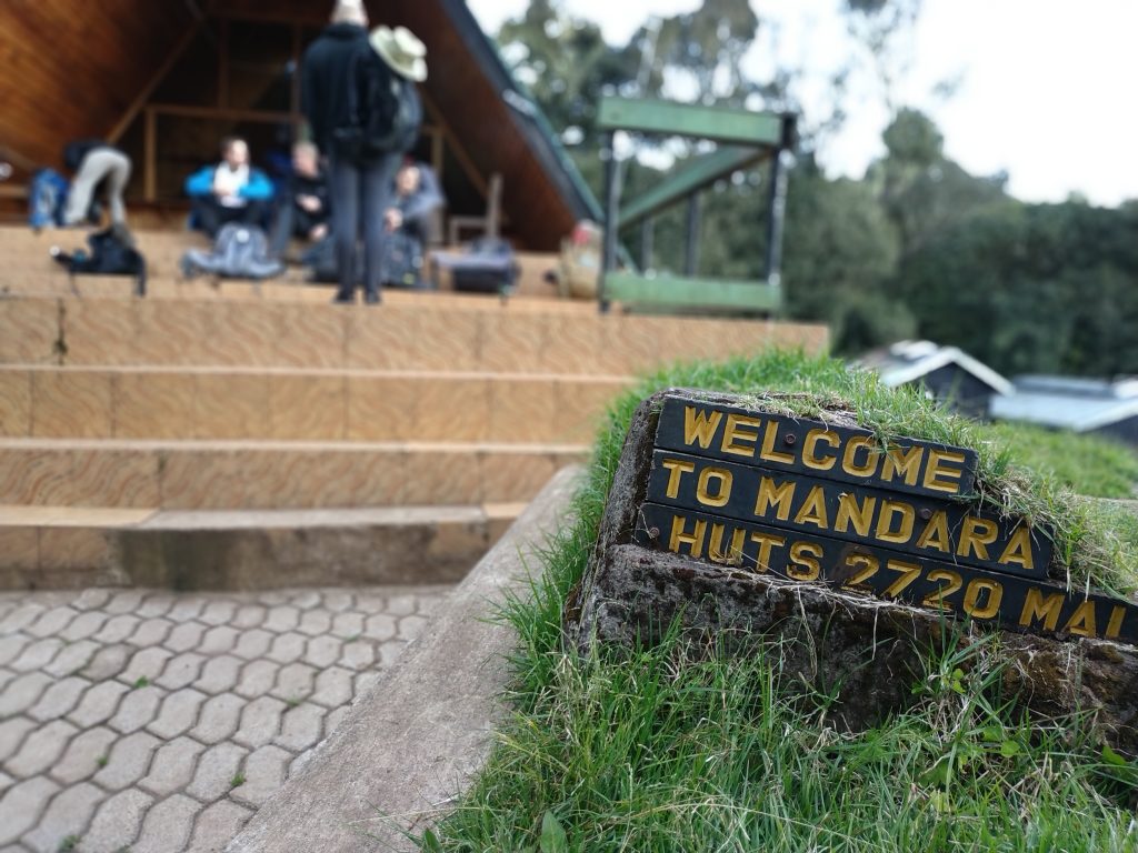 Before we were allowed to enter the national park we had to register at the KINAPA Headquater and pay the entrance fee. From there we started at the Marangu Gate at a altitude of 1879 meters through the jungle to Mandara Hut at 2720 meters. The signs showed a hiking time of 3 hours but we needed a little more than 4 hours. The day ended with an impressive dinner prepared by our two cooks and a nice group chat discussing the first impressions.
