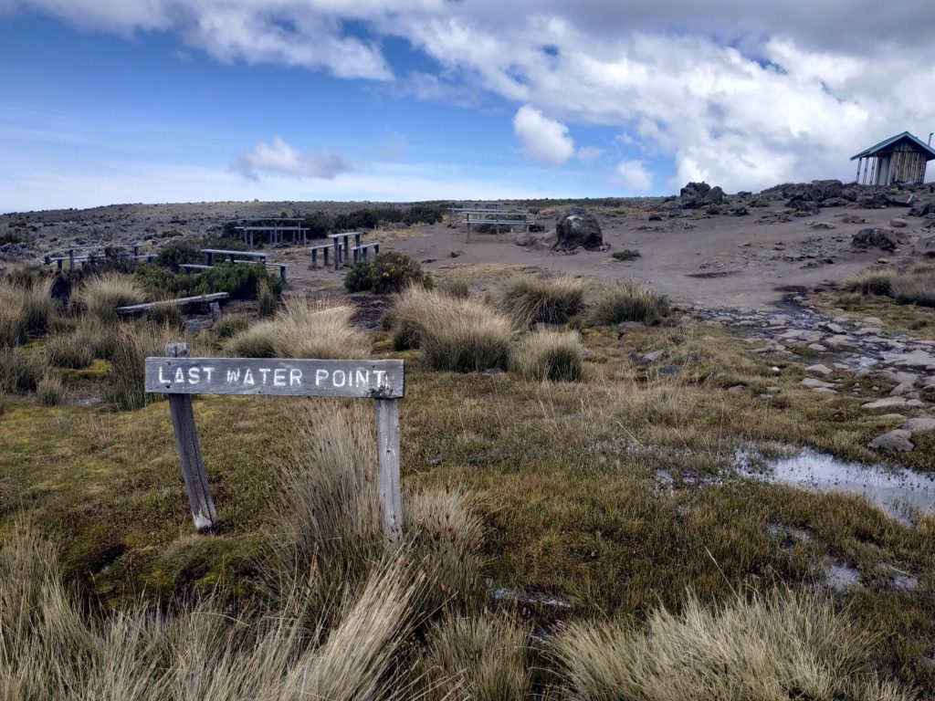 The freshly cooked food is really wonderful and there is nothing to worry about. However, the quantity in relation to the physical work performed is not sufficient for everyone. For this reason it is highly recommended to bring energy bars or something similar from home. Leaving the rainforest makes it necessary to pay special attention to protection from the sun. It took a little bit more than five hours to reach Horombo Hut 3720 meters above sea level. The sign at the entrance of the camp states that we entered the vegetation of moorland.