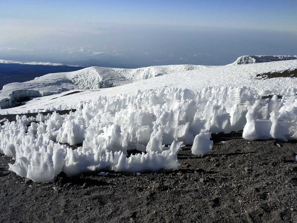 Starting at 1:00 a.m. after a short night and temperatures well below -5 °C we start the final climb. The day ahead will be very long and we will be on our feet for the next 16 hours. But for now we walk in total darkness following the shine of head lights. Five hours later into the climb the sun starts to pass the horizon and provides us with the following three things: light, heat and hope. The sunlight reveals the distance we have traveled and the altitude we are at becomes clear. There is not a single tree, not a single animal or sign of settlement to be seen. A sight that is not easy to find in this modern age. Close to our goal we see snow, ice and can look into the crater of the dormant volcano. At 8:00 a.m. we made it and reached Africa’s highest point the Uhuru Peak of Mount Kilimanjaro at 5895 meters.